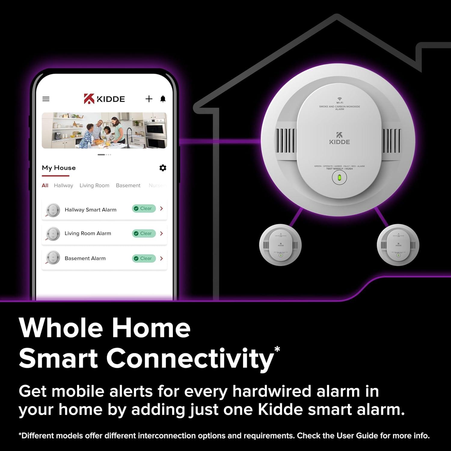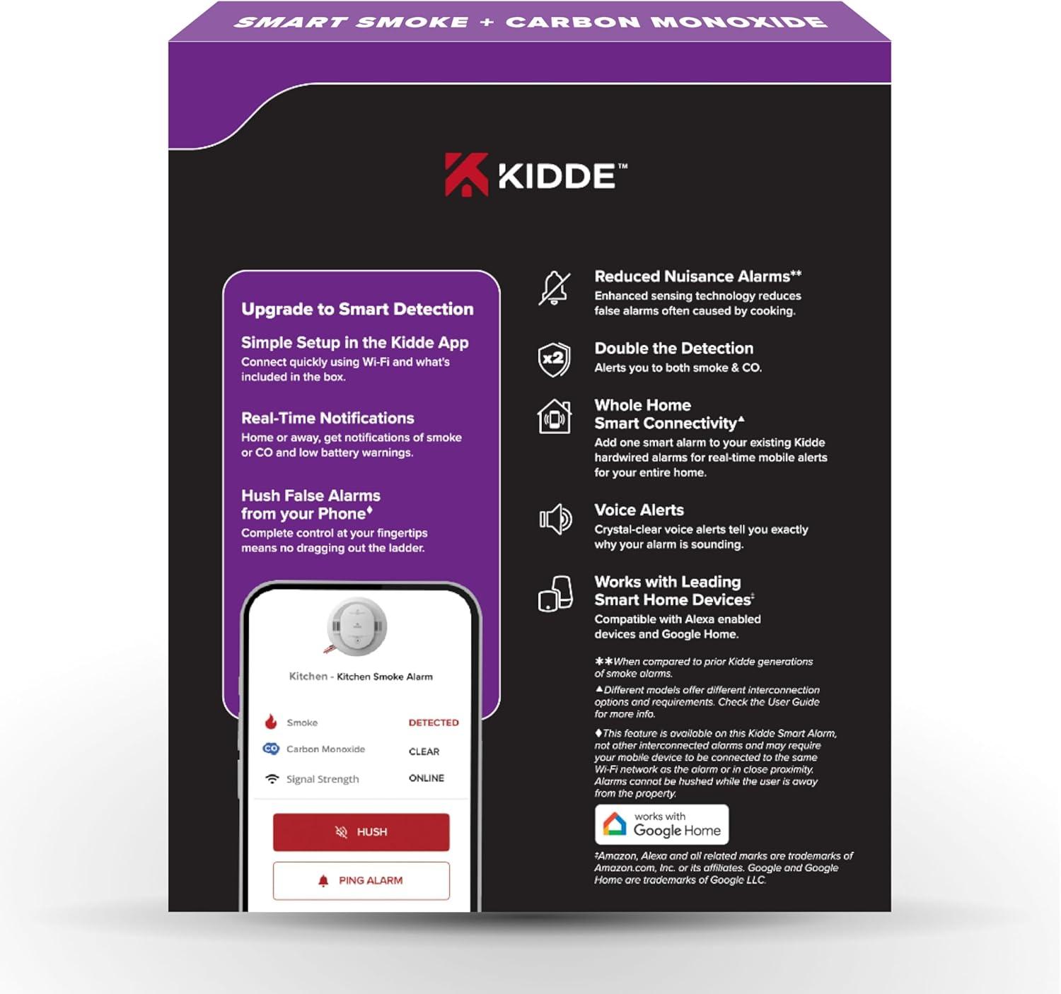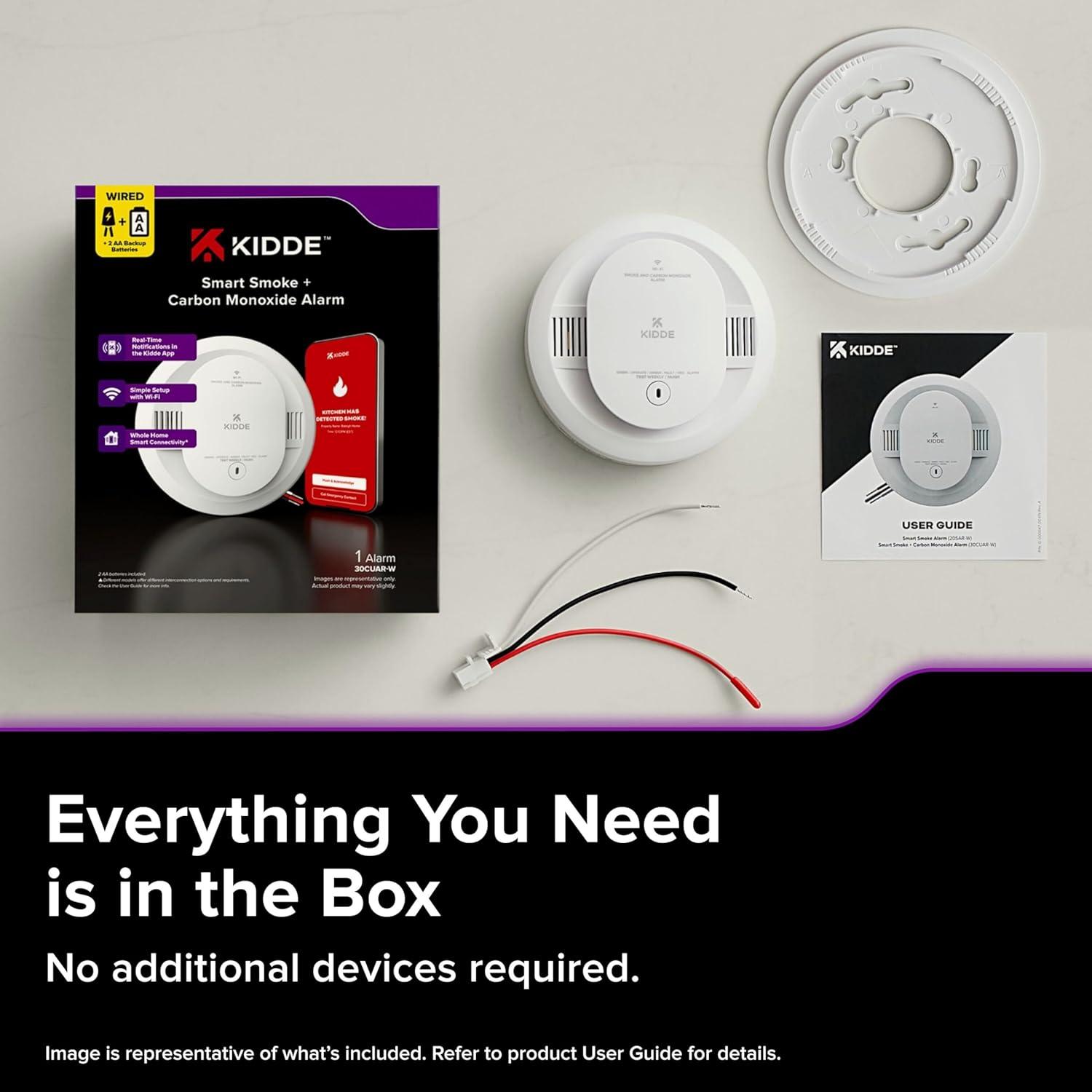 Help protect what matters most with the Hardwired Kidde App Enabled Smart Smoke and Carbon Monoxide Detector, AA Battery Backup, Voice Alerts, Interconnected Alarm. Experience whole home smart connectivity by adding one smart alarm to your existing Kidde hardwired alarms** and get real-time notifications at home or away, including smoke, CO and low battery warnings. Just download the Kidde app to begin alarm setup — no additional devices required. This Kidde app enabled smoke and CO alarm’s enhanced sensing technology features over 25% faster smoke detection*** and reduces false alarms* often caused by cooking. Clear voice alerts announce “Fire!” or “Warning, Carbon Monoxide” to help identify which hazard is detected in your home. Powered by 120V AC wiring with two AA backup batteries (included) to help ensure you’re protected during outages. The hush button ensures your smoke and CO alarm is working and allows you to silence the alarm. * When compared to prior Kidde generations of smoke alarms. ** Different models offer different interconnection options and requirements. Check the User Guide for more info.* When compared to prior Kidde generations of smoke alarms. ** Different models offer different interconnection options and requirements. Check the User Guide for more info. *** In terms of consistency and range of obscuration rate, based on internal testing for Kidde 9th Edition vs. leading competitor 8th Edition products.